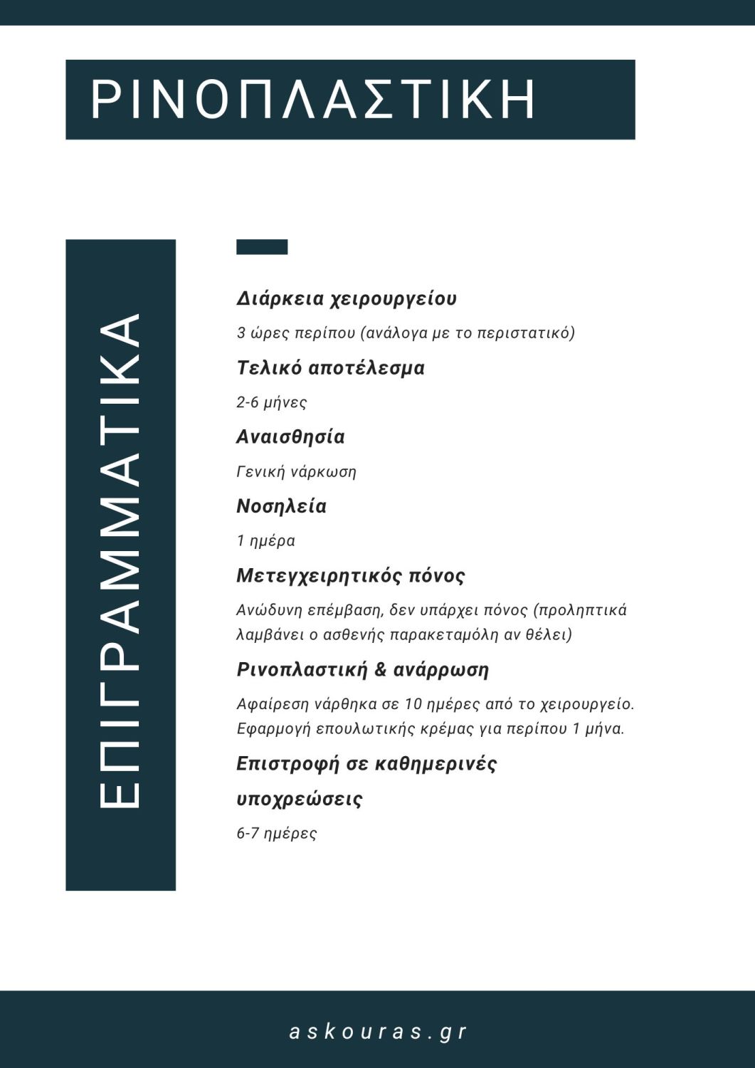 Η ρινοπλαστική είναι η συχνότερη επέμβαση στο πρόσωπο αλλά και η δυσκολότερη. Θα πρέπει να τονισθεί ότι η διάρκειά της δεν είναι μικρότερη των δύο ωρών και με κανένα τρόπο δεν είναι η επέμβαση της μισής ώρας που πολλοί υποστηρίζουν.